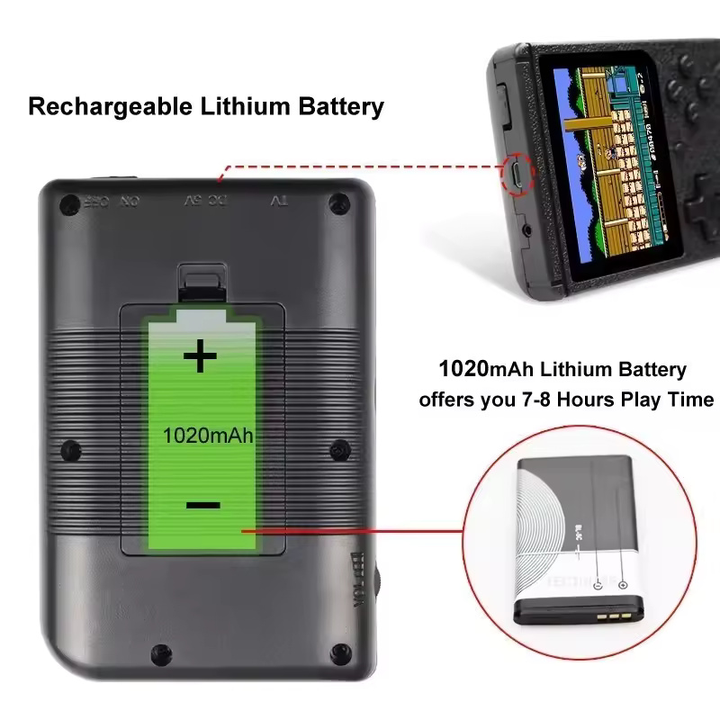 This handheld console comes with 1020mAh rechargeable lithium battery, more than 7 hours of battery life. When you are on a business trip, traveling, camping, you don’t have to worry about running out of power.